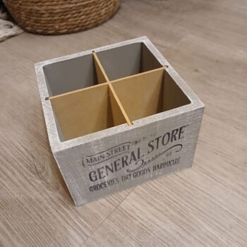 - Cajon cubiertero de madera vintage patinado con 4 divisiones de 16 x 11 cm $8.400