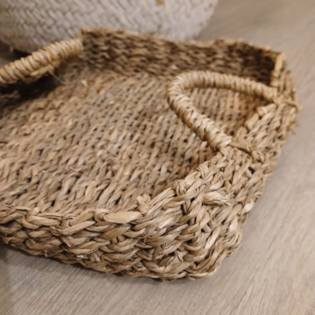 3 cuotas s/interés de $9333 -20℅ off en efectivo $22400Bandeja redonda de seagrass con manijas tamaño chico.