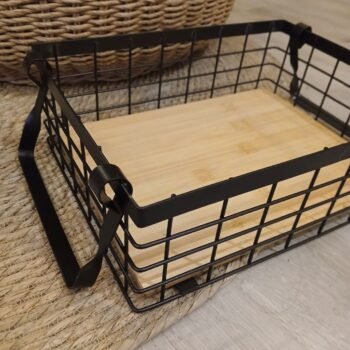 3 cuotas s/interés de $12060 -20℅ off en efectivo $28944Canasto organizador rectangular de estructura metálica color negro con manijas y base de madera.