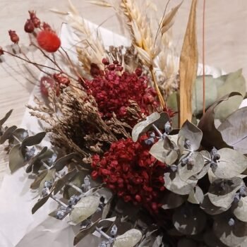 3 cuotas s/interés de $4633 -20℅ off en efectivo $11120Ramo de flores preservadas con ramas de eucalipto y flores rojas estilo San Valentín de 30 x 20 cm aproximadas.