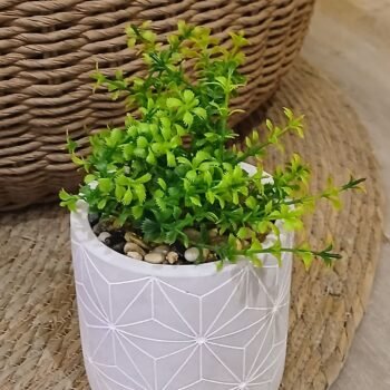 - Maceta de cemento con lineas pintadas y planta artificial de 15 x 16 cm