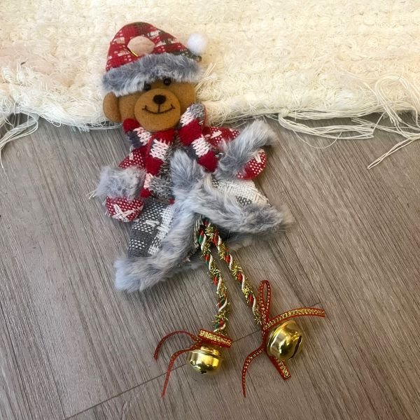 Adorno colgante de telas combinadas Oso con cascabel de 12 x 22 cm