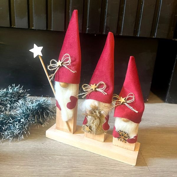 Adorno navideño artesanal de madera con 3 muñecos Papa Noel en telas