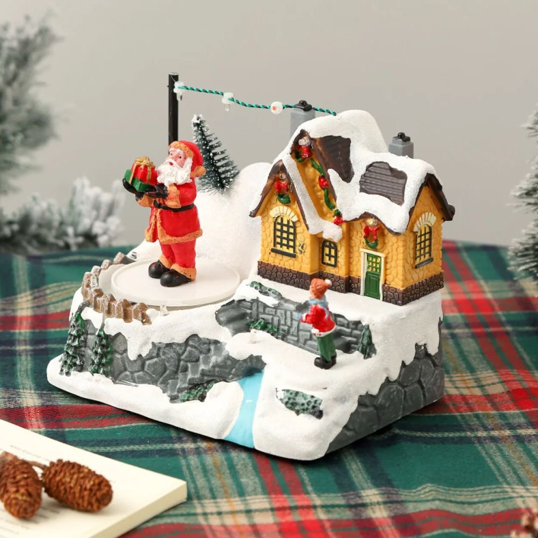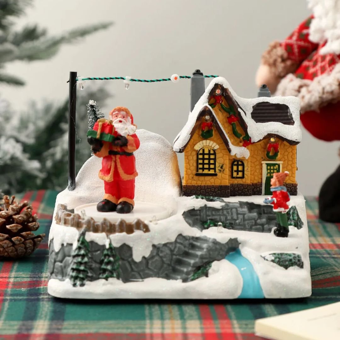 Dale vida a tu decoración navideña con esta hermosa casita iluminada. Fabricada en resina y plástico, presenta una encantadora escena de Papá Noel con un duende en un paisaje nevado lleno de detalles. Sus luces LED de colores y la música integrada crean un ambiente mágico y festivo, ideal para mesas, estanterías o como centro de decoración.