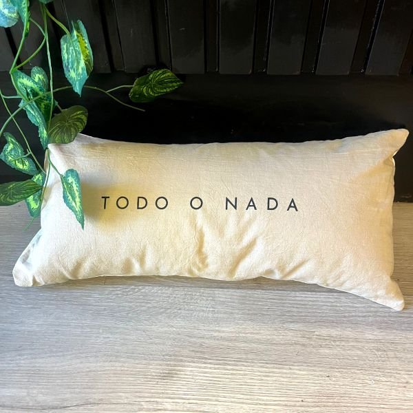 Almohadon de 50 x 25 cm en color beige estampado con frase: Todo o nada