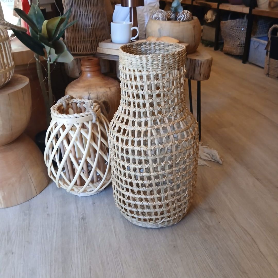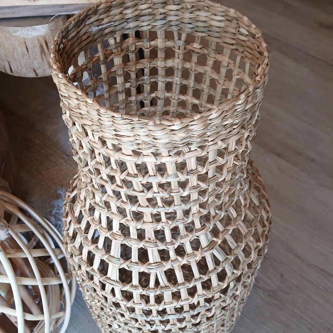 Florero ánfora cesto de fibras naturales calado de 50 x 20 cm