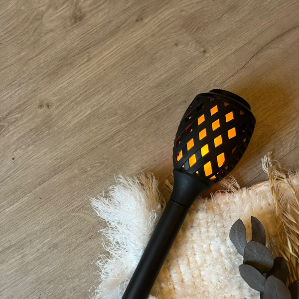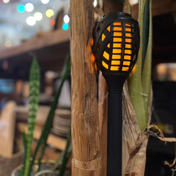 Antorcha con 12 luces LED que vienen dentro de un tubo en color amarillo que simulan ser llamas de fuego. Esta diseñada con una estaca para que se pueda colocar en jardines o en macetas.
