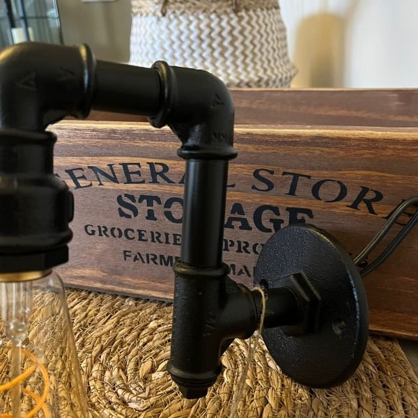 Aplique de pared artesanal con diseño y estilo industrial hecho con cañería galvanizada de 1/2 pintado de negro.