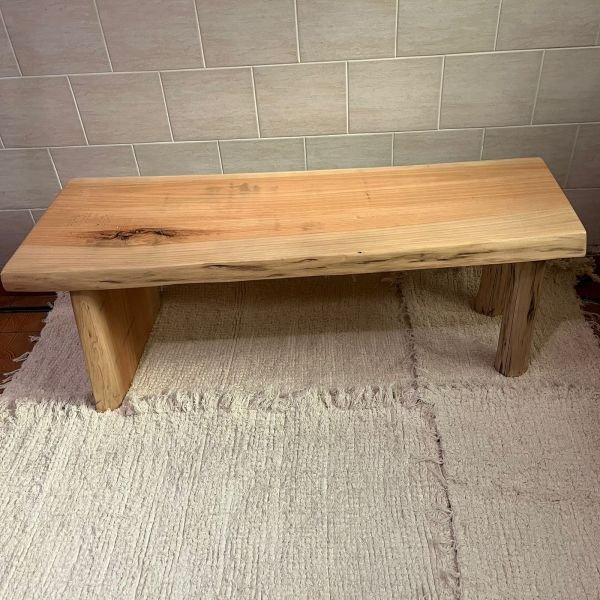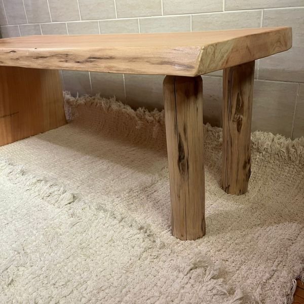 Banco artesanal único con bordes y vetas propias de la madera de ciprés y patas de madera