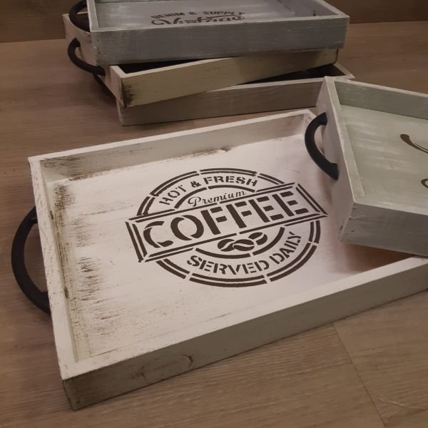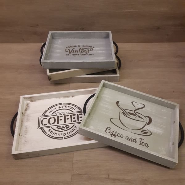 Bandeja de madera con manijas vintage patinada de 32 x 26 cm