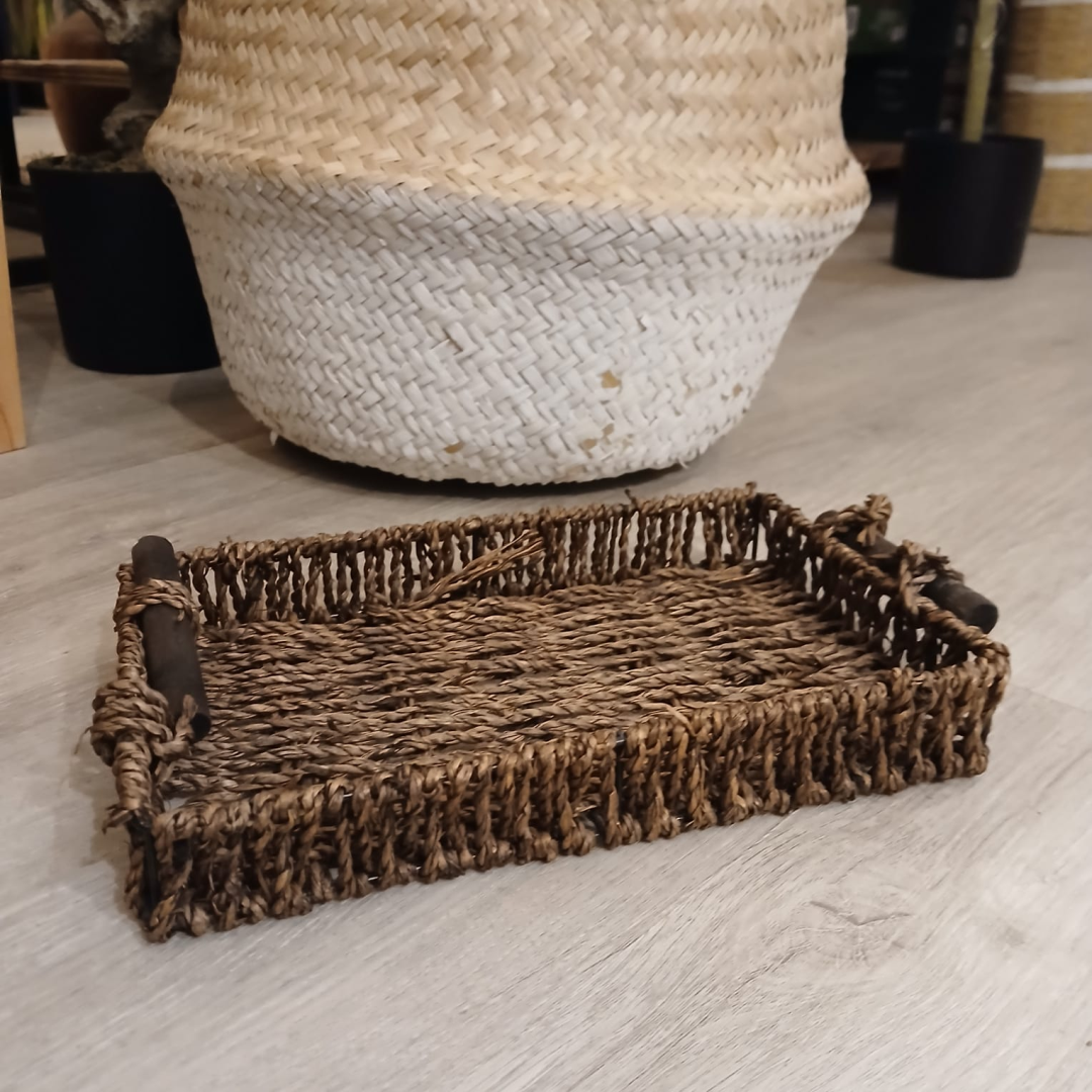 Bandeja de seagrass marron con manijas de madera de 23 x 14 x 4 cm