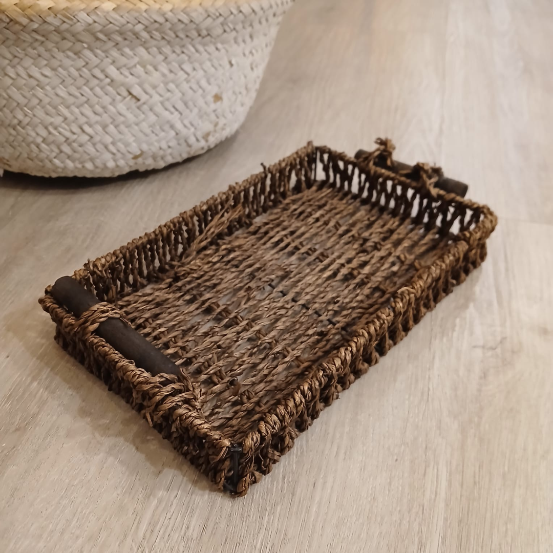 Bandeja de seagrass natural color marrón oscuro con manijas de madera de 23 x 14 x 4 cm.