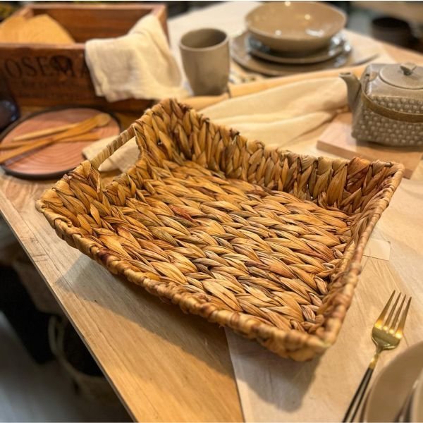 Bandeja de seagrass mediano en estructura de metal y asas de 29 x 22 cm