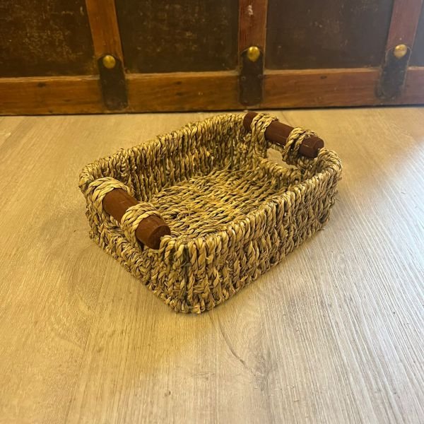 Bandeja de seagrass natural con manijas de madera chica de 20 x 16 x 7 cm