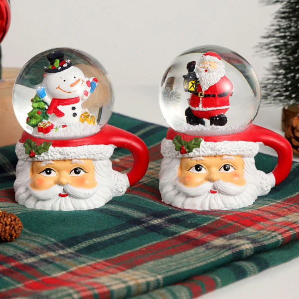 Originales bolas de nieve decorativas con base en forma de taza de Papá Noel. Cada esfera contiene una figura navideña en miniatura (Papá Noel o muñeco de nieve), que al agitarse crea un efecto mágico con copos brillantes. Fabricadas en resina y vidrio, combinan color, brillo y ternura, siendo el detalle perfecto para decorar mesas, repisas, escritorios o regalar en las fiestas.
