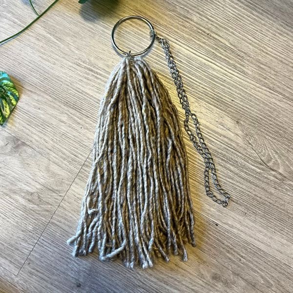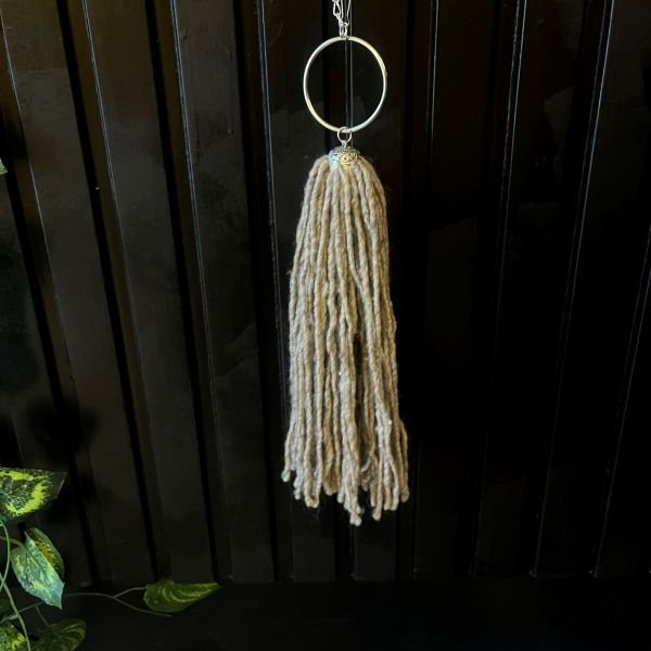 Borla sujeta cortina colgante con aro de metal e hilos de algodon gris