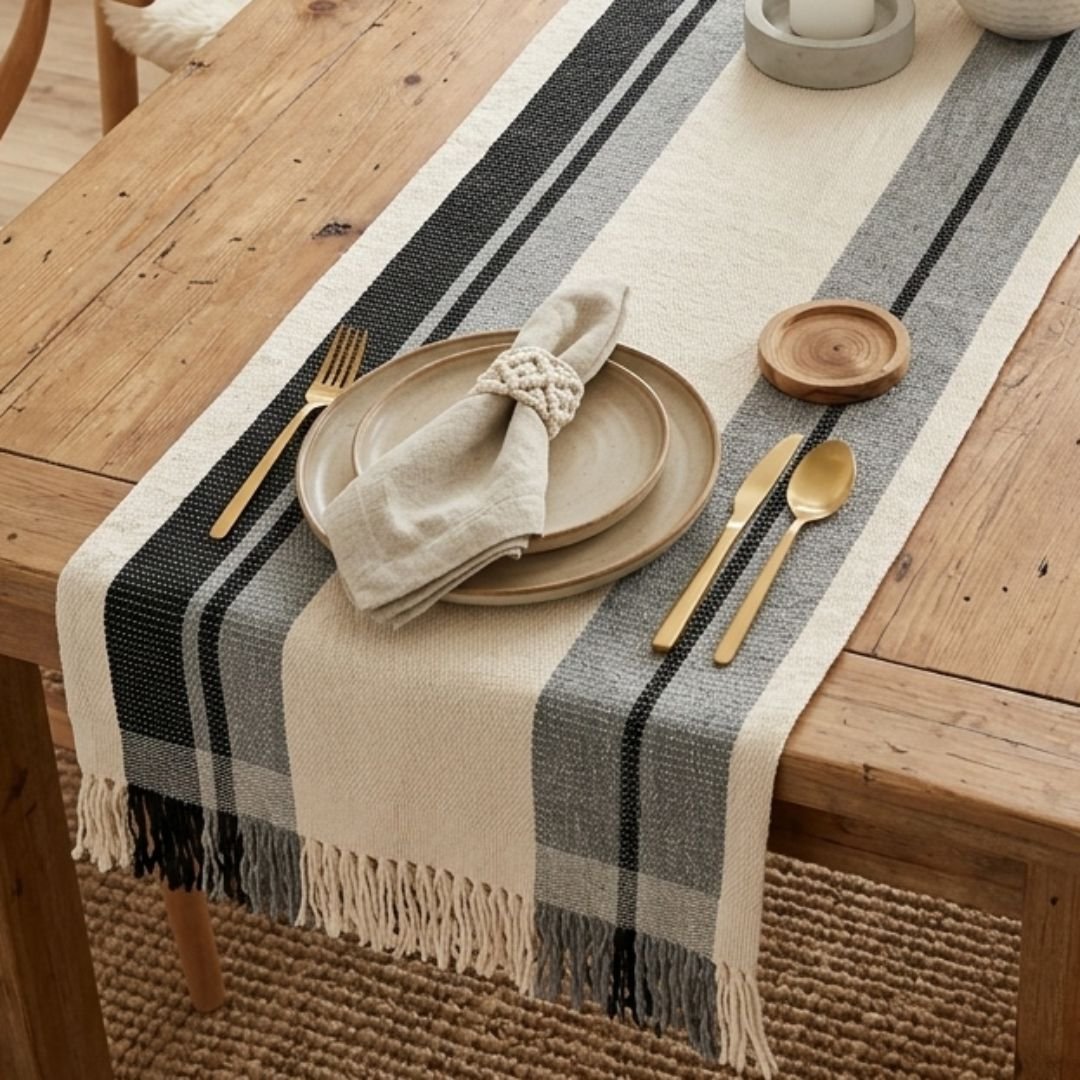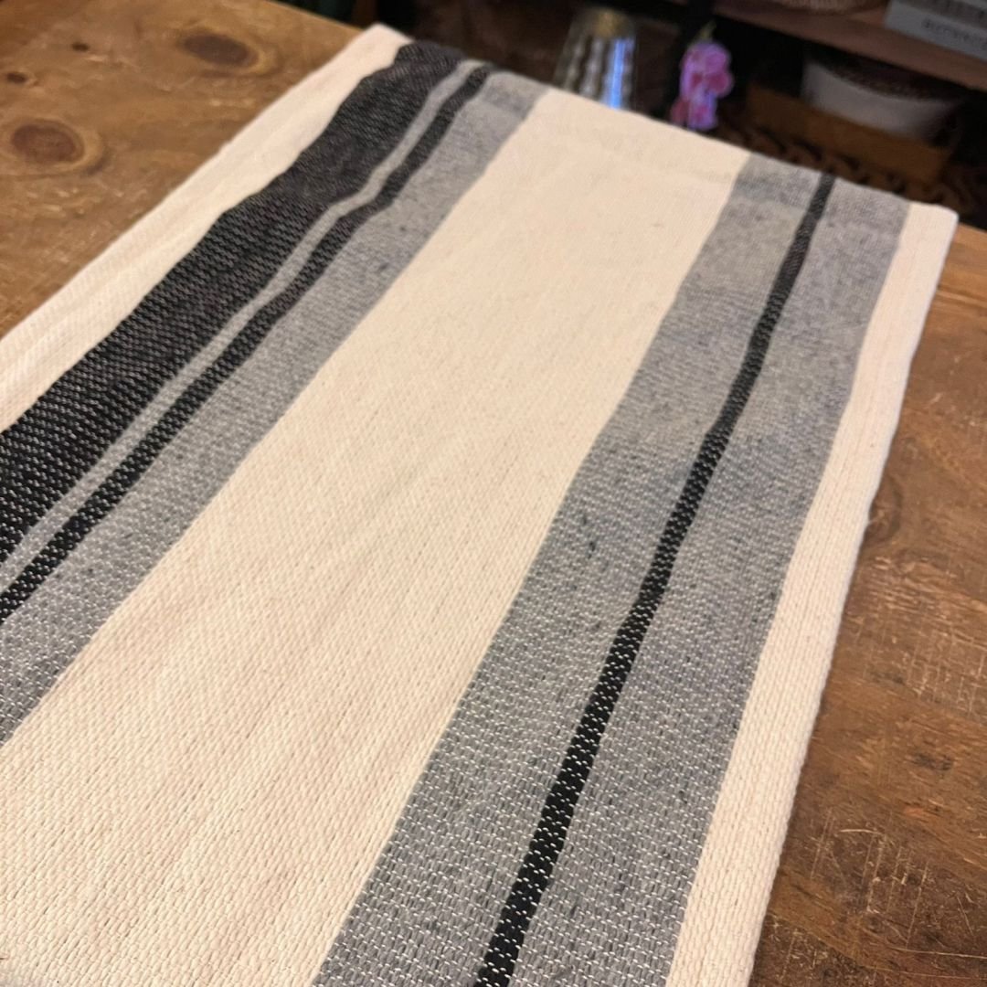 Camino rayado combinado color crudo, gris y negro fabricado en 100% algodón tejido en telar estilo rustico.