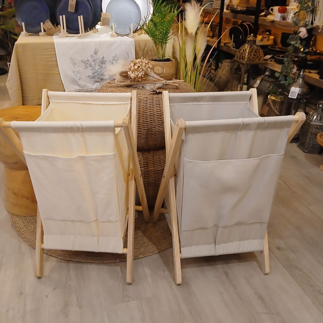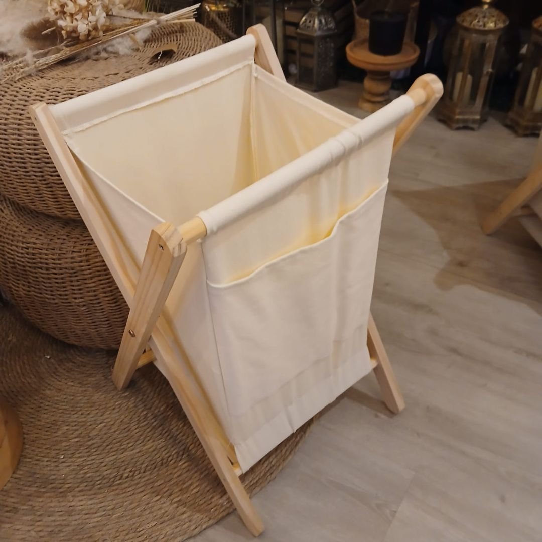 Canasto plegable para ropa de madera con tela.