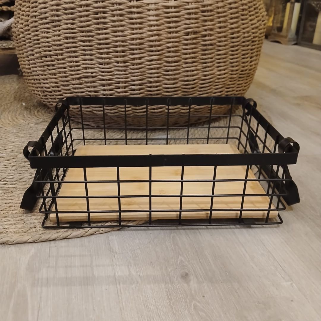 Canasto organizador rectangular de estructura metálica color negro con manijas y base de madera.