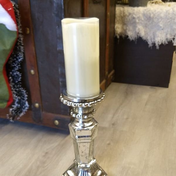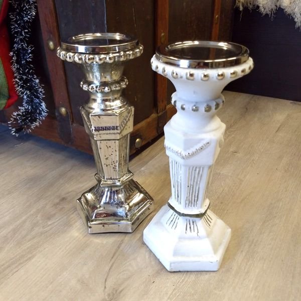Candelabro posa vela de vidrio de 30 cm de altura en versión blanco o plateado