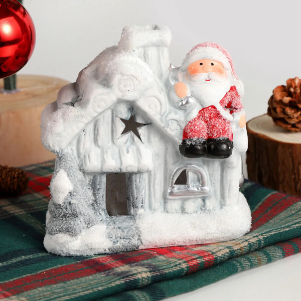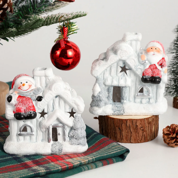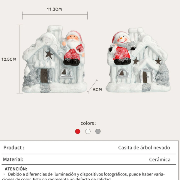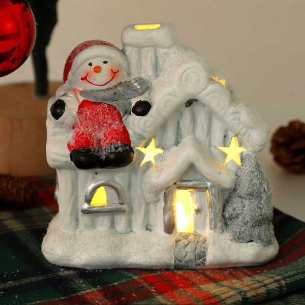 Encantadora casita decorativa con diseño invernal y detalles navideños. Incluye un simpático muñeco de nieve con gorro rojo y ventanas en forma de estrellas que, al encender la luz led interior, iluminan cálidamente el ambiente. Ideal para decorar mesas, repisas, chimeneas o el árbol de Navidad, creando un efecto acogedor y festivo.