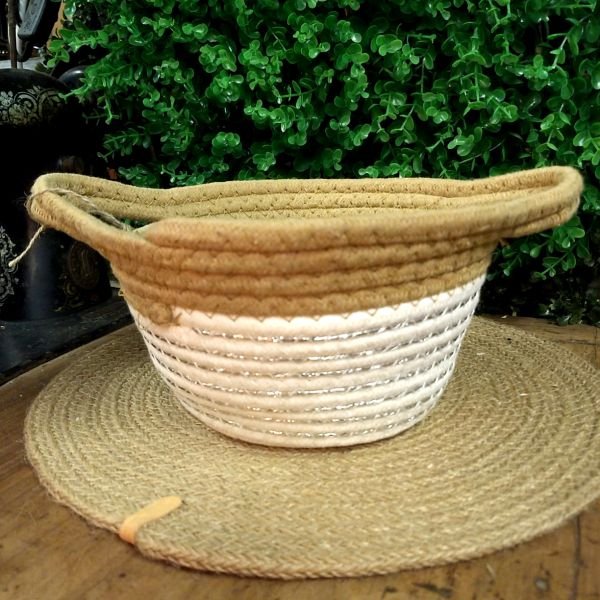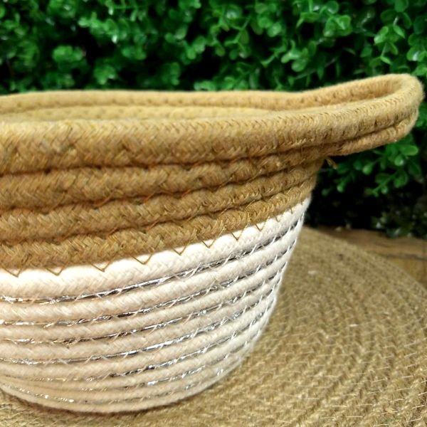 Cesta combinada chica en Yute blanco y habano e hilos plateados con manijas de 20 x 12 cm