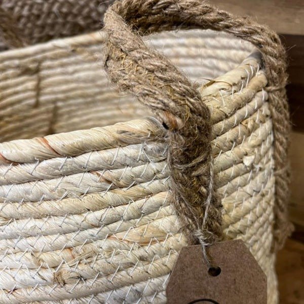 Cesta grande 30 cm diámetro x 22 cm de alto. Yute natural liso con manijas en color habano.