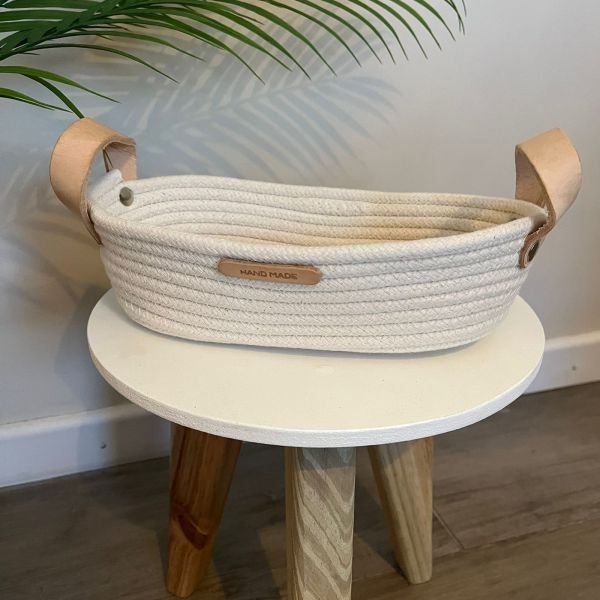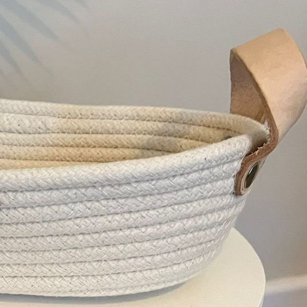 Cesto ideal para panera de soga blanco con manijas de cuero en forma de ovalo