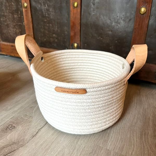 Cesto panera redondo estilo nordico con manijas en cuero de 19 x 13 cm