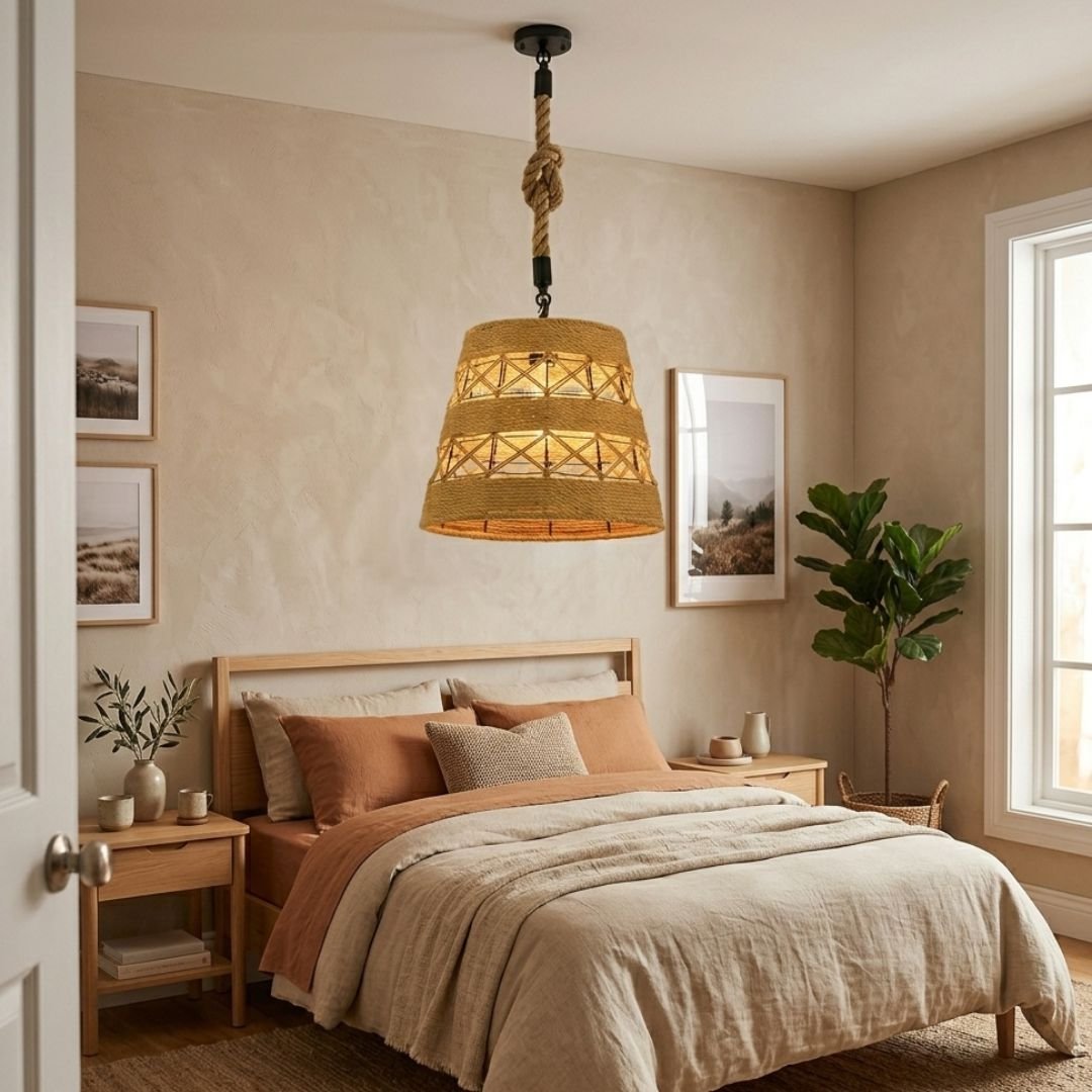 Colgante tipo jaula de metal negro con soga de yute trenzada.