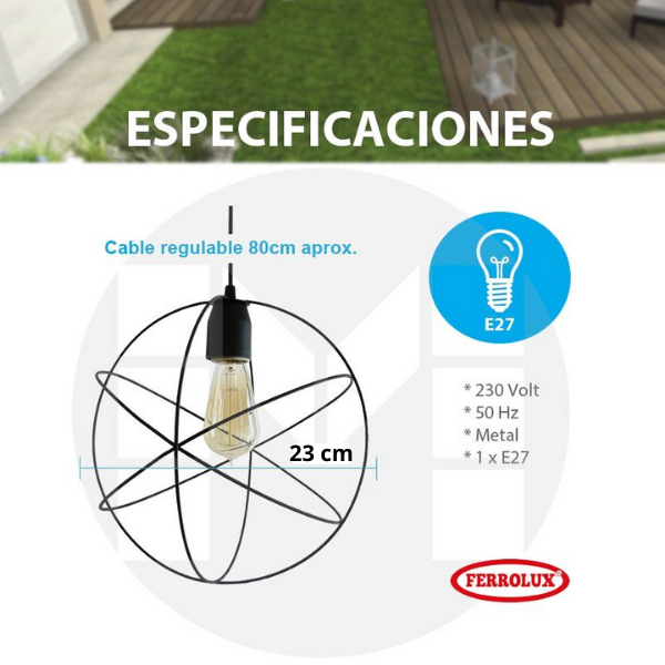 – Dimensiones: Esfera Ø 23cm, 1 luz florón 11cm / Largo de cable: 80cm aproximadamente (regulable)