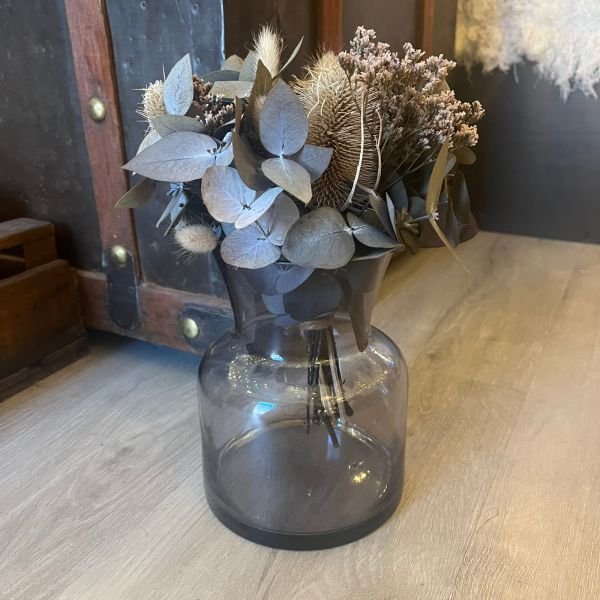 Florero de vidrio tonalizado smoked de 13 x 17 cm con ramo de flores secas estilo bouquet.