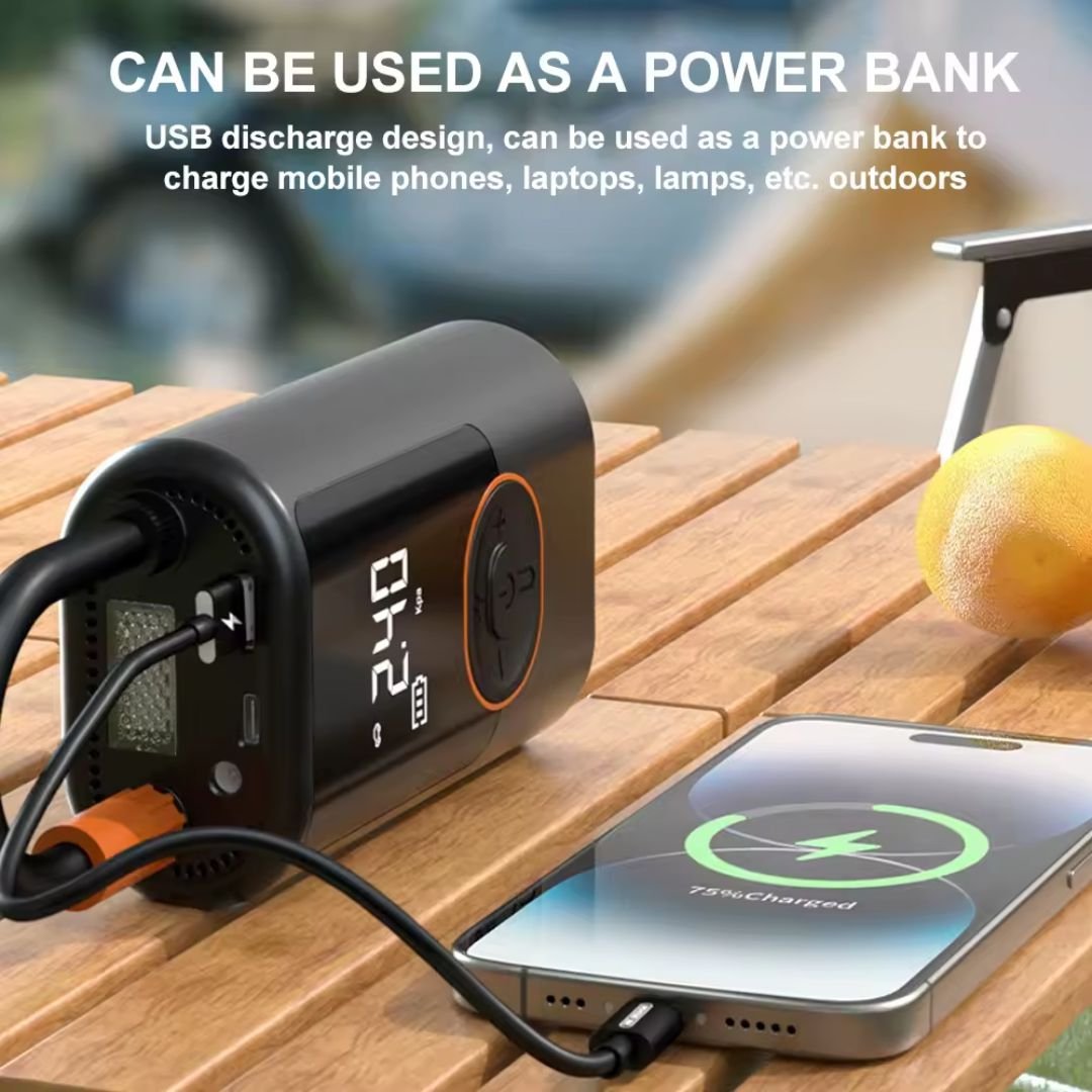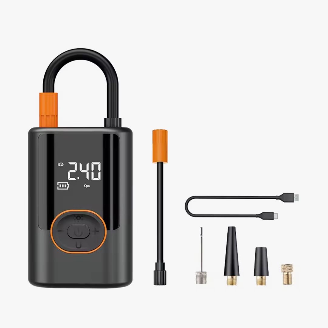 1 compresor de aire portátil para neumáticos, 1 manguera de inflación, 1 Cable USB C, 1 cabezal de conversión inflable ancho, 1 cabezal de conversión inflable fino, 1 aguja para pelotas