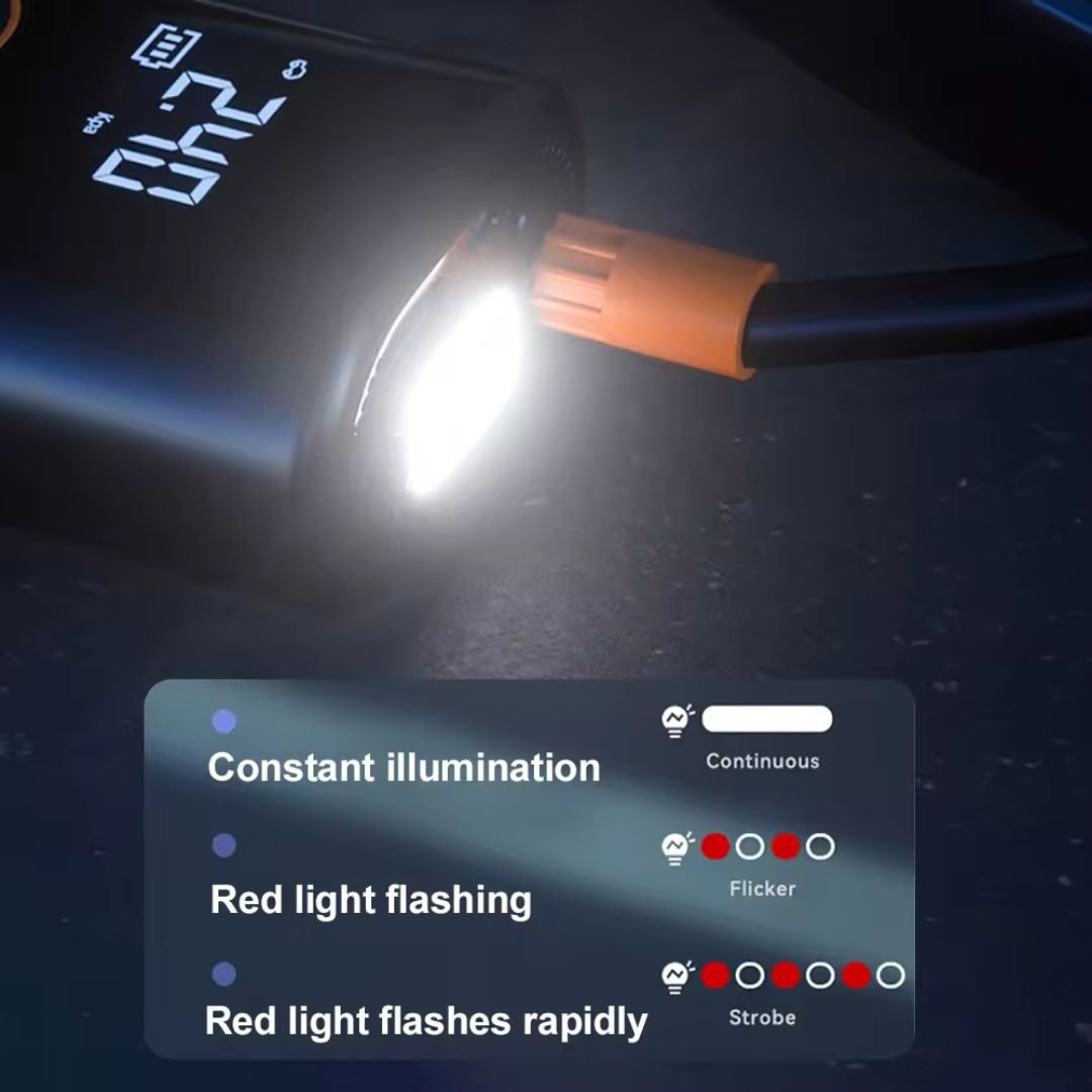 Incluye linterna y baliza LED para inflar fácilmente los neumáticos por la noche.