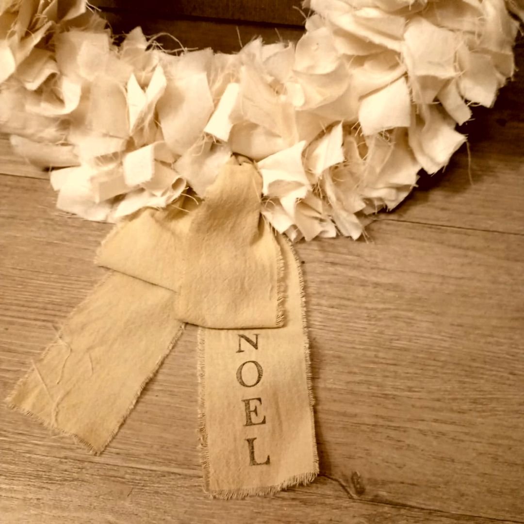 Corona de tiras de liencillo natural con base de madera y faja estampada