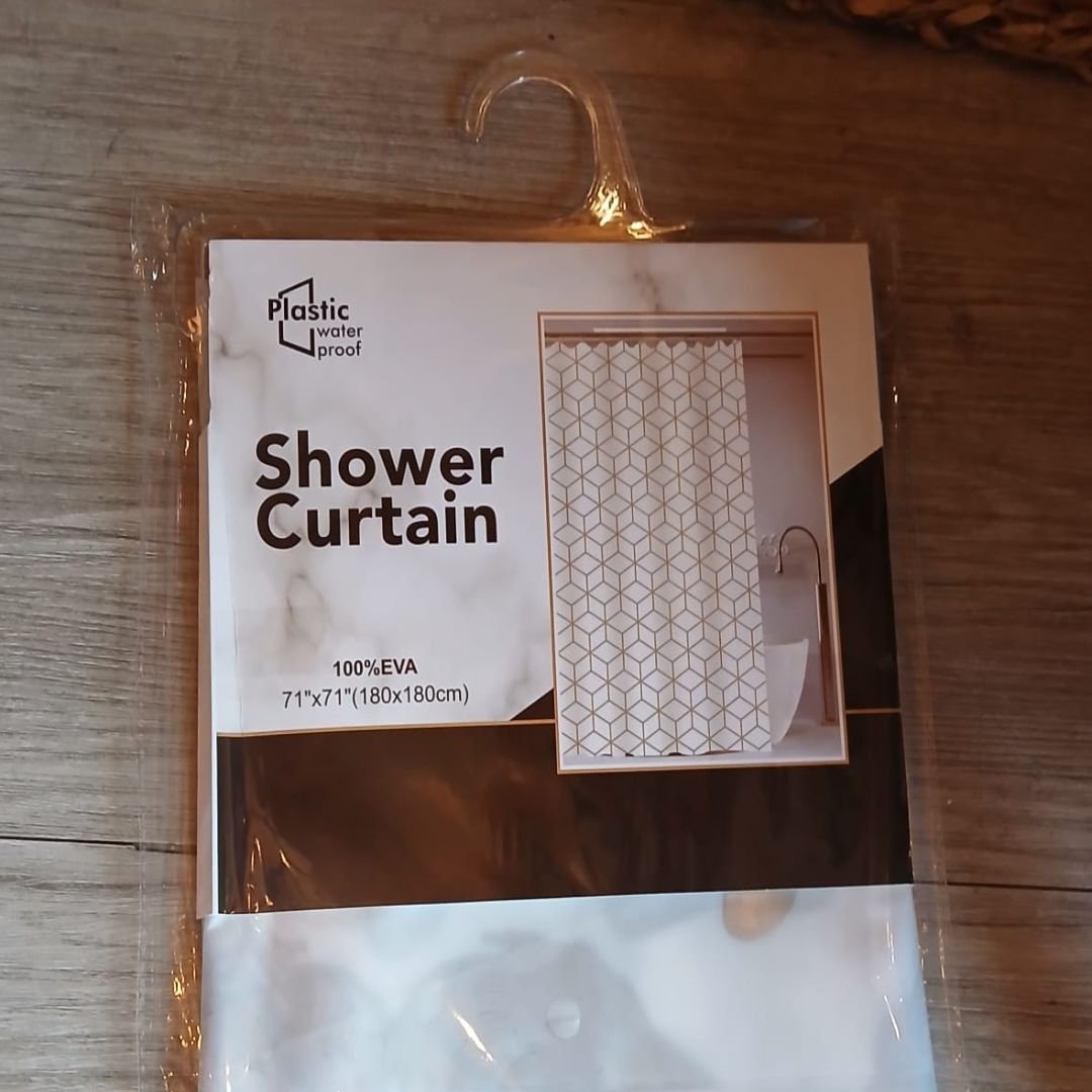 Cortina de baño de polietileno color blanco con estrellas de mar con 12 ganchos plásticos.