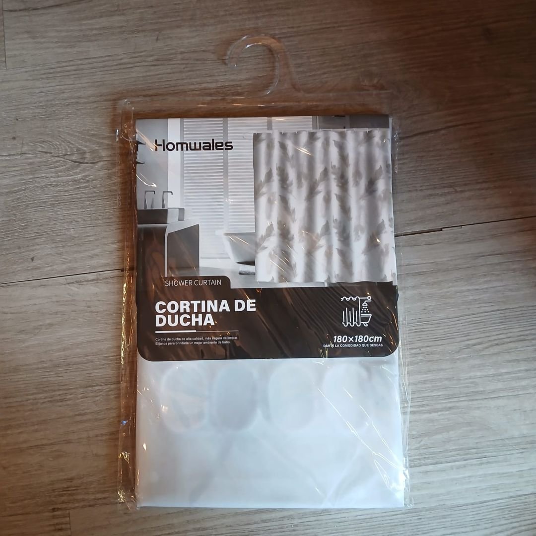 Cortina de baño de polietileno color blanco con plumas con 12 ganchos plásticos.
