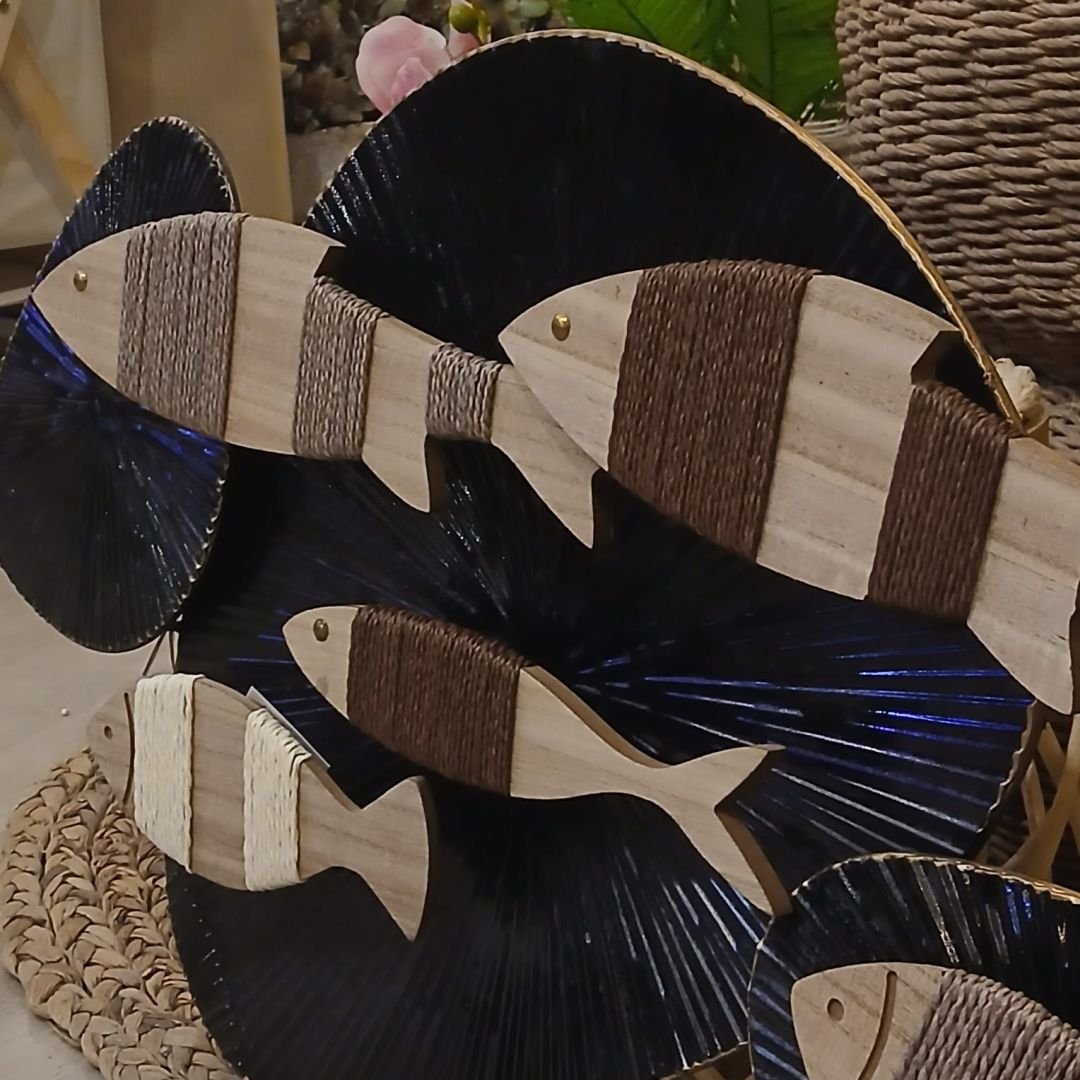Cuadro friso decorativo de metal para colgar en la pared con peces de madera e hilo.