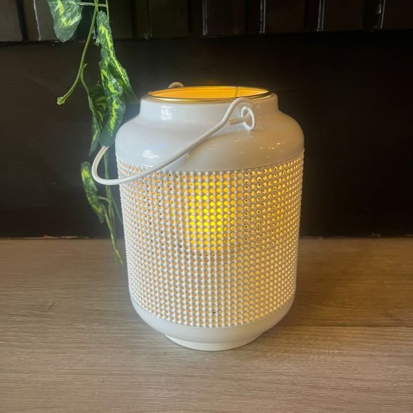 Fanal de metal calado blanco con manija y posa vela desmontable de vidrio