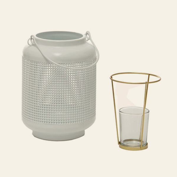 Fanal de metal calado blanco con manija y posa vela desmontable de vidrio con detalles de metal dorado