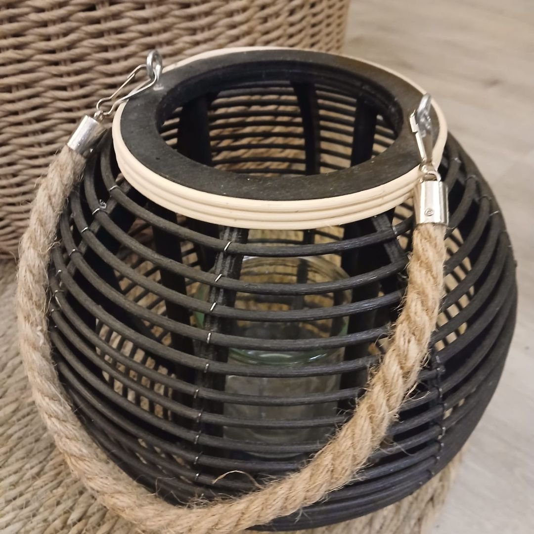 Fanal negro de fibras naturales con manija de soga de 15 x 25 cm