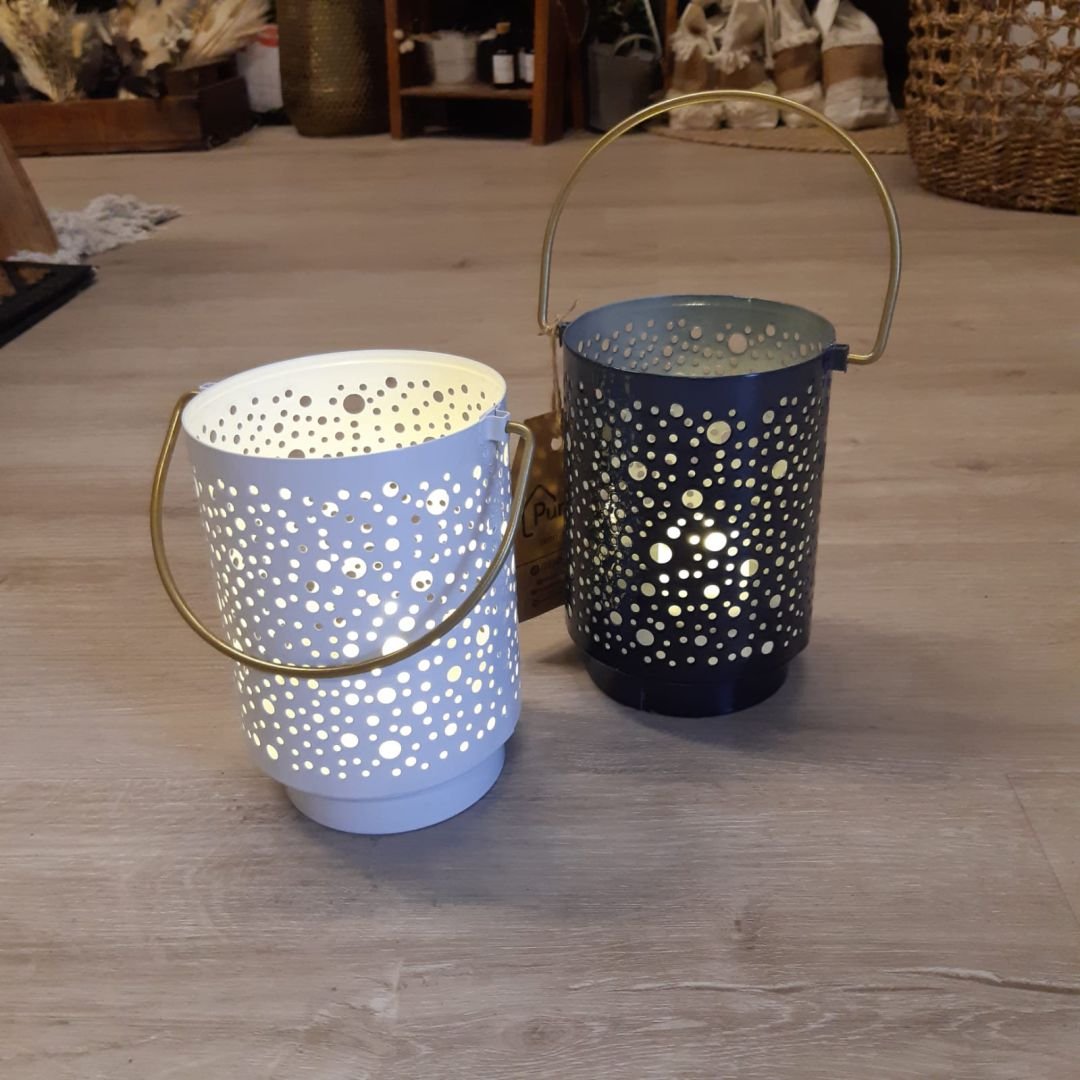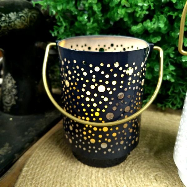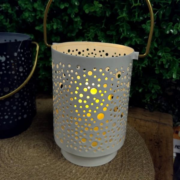 Fanal porta vela metalico calado con manija dorada en 2 colores de 10 x 14 cm