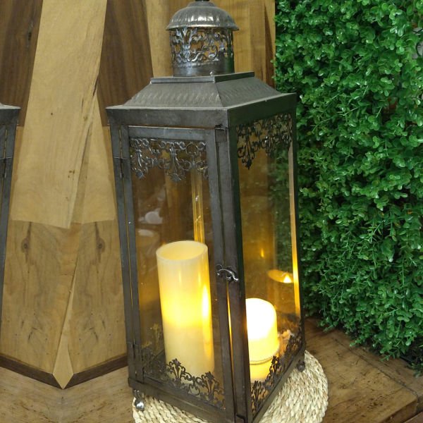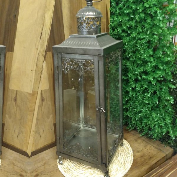 Farol porta vela metalico antique plateado grande de 60 cm de alto