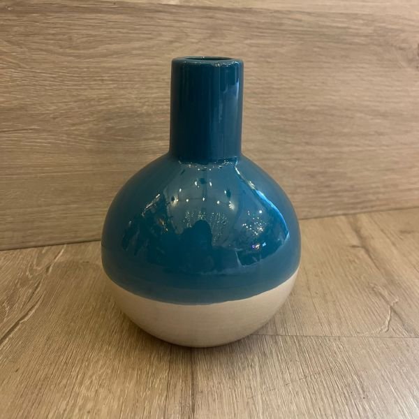 Florero combinado de ceramica blanco y turquesa de 12 x 16 cm