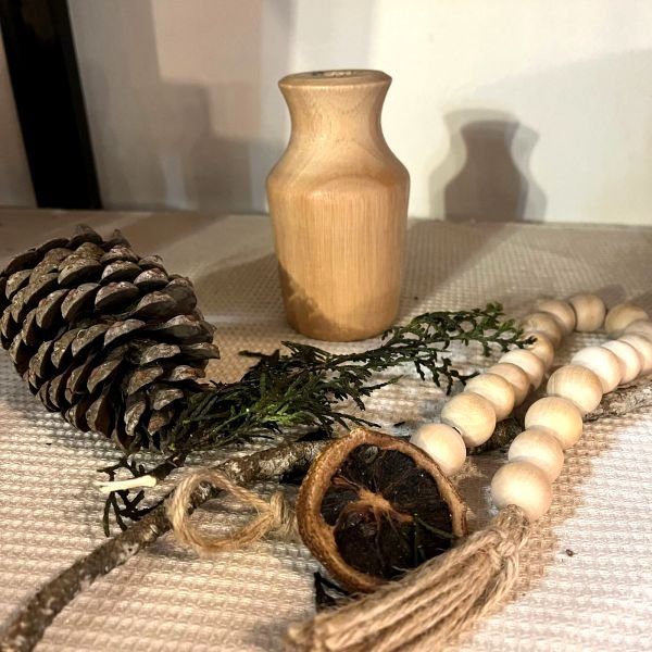 Florero estilo botella de leche chica de madera torneada de una sola pieza.