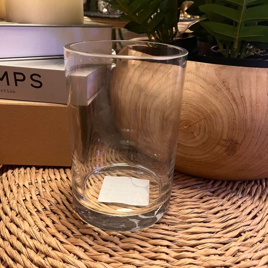 Florero de vidrio liso tipo cilindro de 10 x 15 cm.