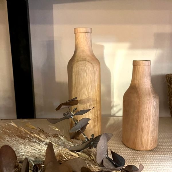 2 floreros estilo botella de madera torneada de una sola pieza.