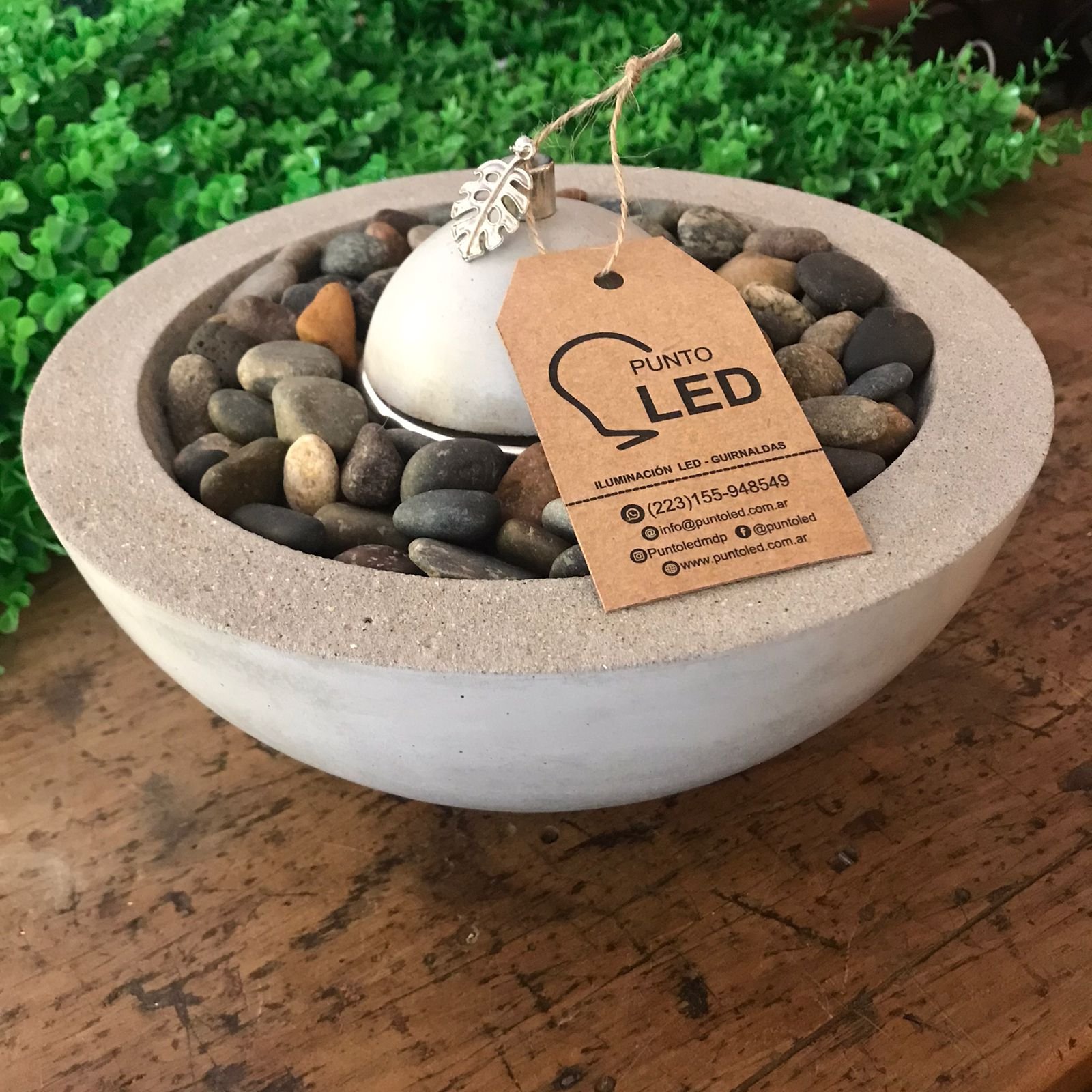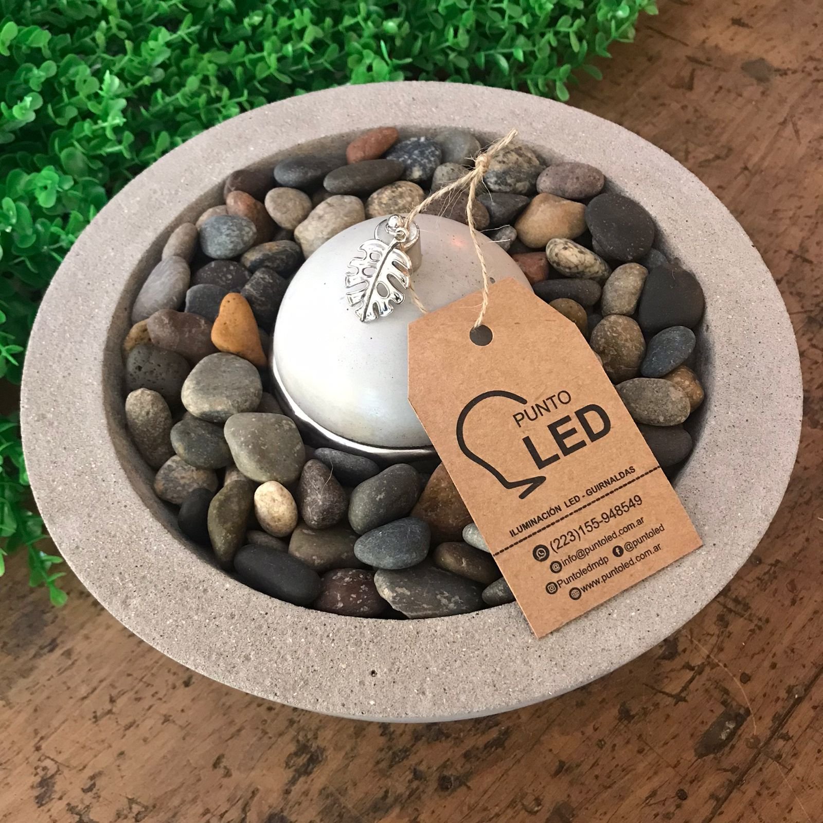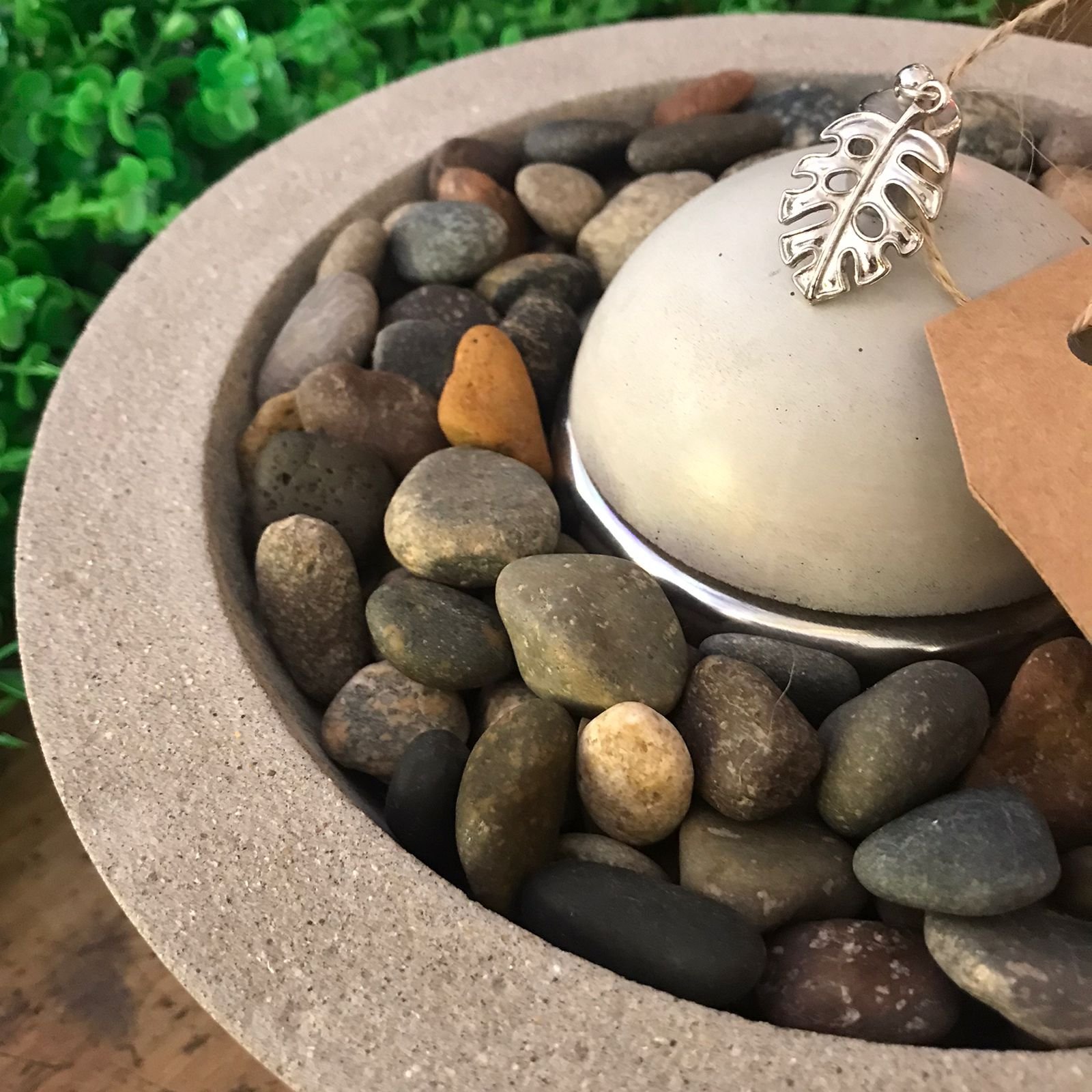 Fogonero redondo de cemento tipo cuenco con canto rodado de 23 x 8 cm con tapa y detalle en monstera.