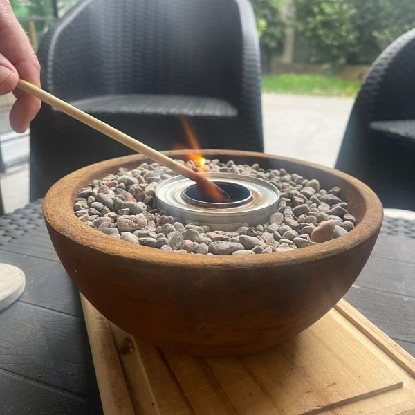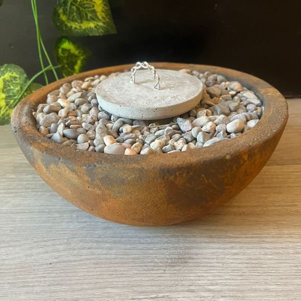 Fogonero redondo de cemento tipo cuenco con canto rodado de 23 x 9 cm aproximados con tapa y pintura estilo oxido.