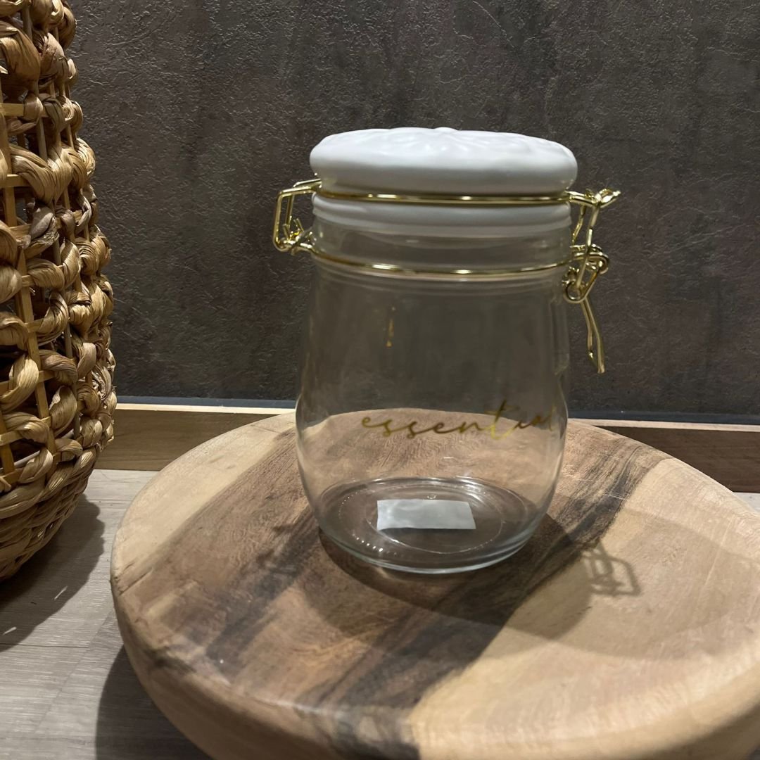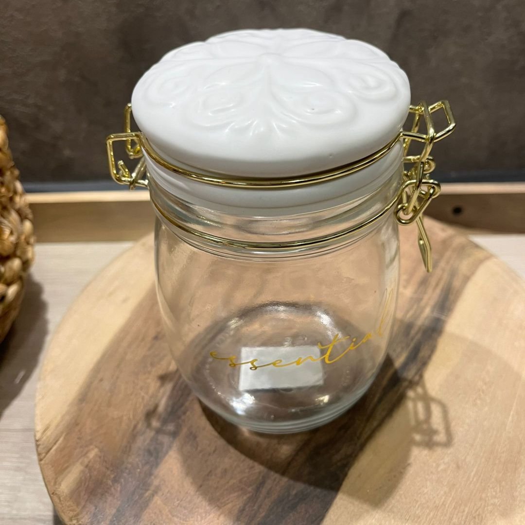 Tapa de cerámica labrada color blanca con sistema de cierre hermético en dorado.
